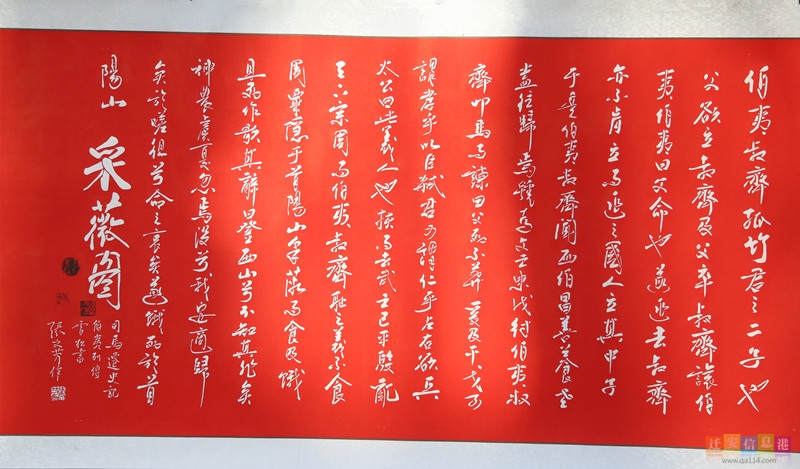 据了解,这幅《采薇图》作品历时两个多月,作品长4.3米,宽0.8米,以中国红为主色调。作品左侧由黑龙江书法协会雪松题字,张文芳刻写,内容出自司马迁史记—伯夷列传,右侧以宋代李唐《采薇图》为蓝本。整幅作品人物刻画生动细腻,文字铿锵有力,令人叹为观止。(编辑:李娜)