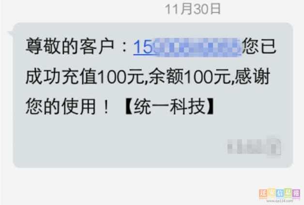 据市民邵先生介绍,11月30日,一个以前的朋友联系到邵先生,称“可以交45元充100元话费”,并称已经为邵先生办理好了缴费充值业务。随后,邵先生手机上收到一条信息,内容显示:“尊敬的客户:您已成功充值100元,余额100元,感谢您的使用!”,署名为“统一科技”。