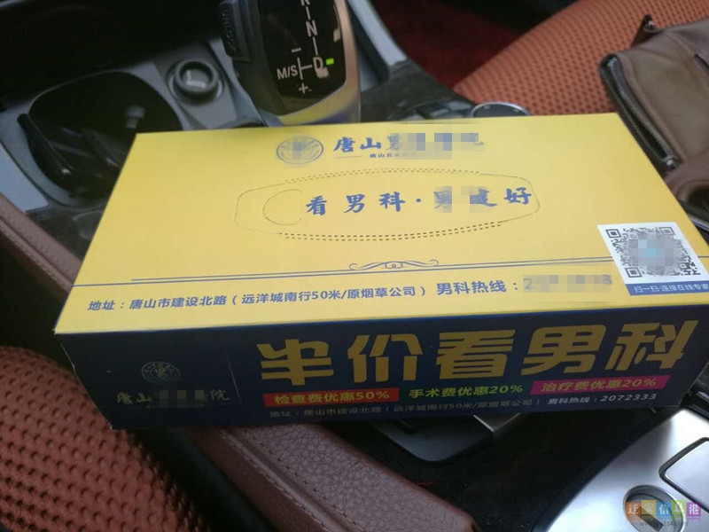 随后张先生的车窗前,张先生摇下车窗,只见这位中年妇女塞进来的是一盒纸巾,盒子上印有唐山某男科医院字样。