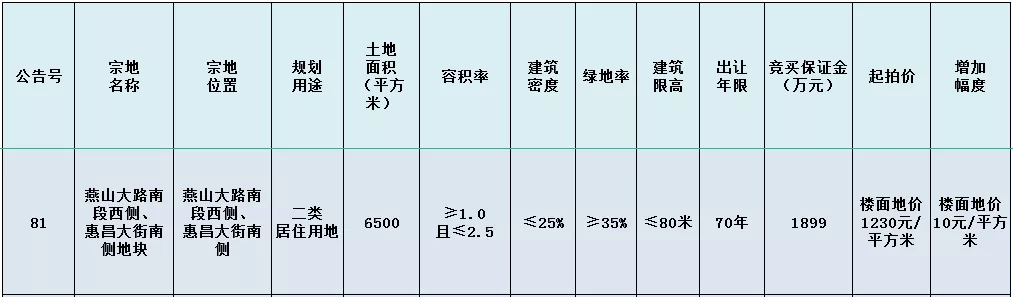 出让地块位于燕山大路南段西侧、惠昌大街南侧,土地面积6500平方米,规划用途为二类居住用地,容积率:≥1.0且≤2.5,建筑密度≤25%,绿地率≥35%,建筑限高80米,出让年限70年,竞买保证金1899万元,起拍价为楼面地价1230元/平方米。