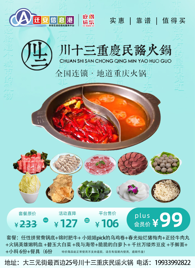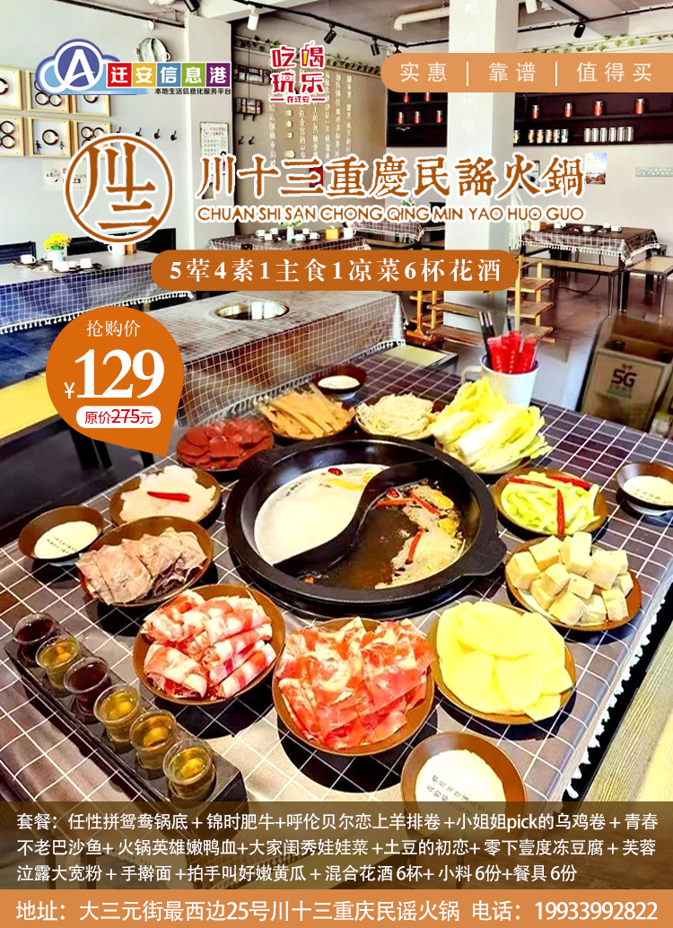 优选首页 > 川十三重庆民谣火锅 川十三重庆民谣火锅 (营业时间:11:00--22:00) 评分:0 19933992822 三元街最西边25号 证书资质 店铺介绍: 排序方式: 综合排序 销量 价格 商家店铺 扫我购买 【川十三火锅】129元抢购超值6人餐任性双拼鸳鸯锅+5荤5素+拍黄瓜+手擀面+6杯花酒+小料餐具6份 商家店铺 扫我购买 【川十三火锅】106元抢购4-6人餐任性双拼鸳鸯锅+5荤4素+手擀面+小料餐具6份