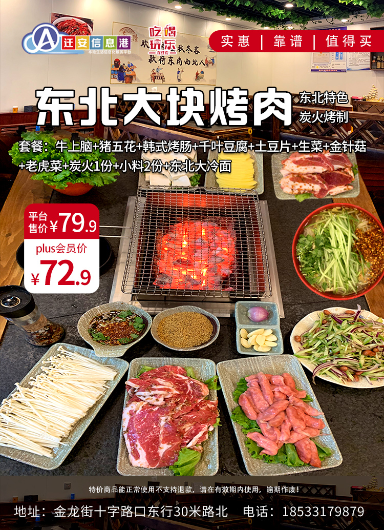 优选首页 > 东北大块烤肉 东北大块烤肉 (营业时间:11:00-23:00) 评分:0 18533179879 金龙街十字路口东行30米路北 证书资质 店铺介绍:东北大块烤肉 排序方式: 综合排序 销量 价格 商家店铺 扫我购买 东北特色烤肉,炭火烤制!79.9元2人餐,牛上脑+猪五花+韩式烤肠+千页豆腐+土豆片+生菜+金针菇+老虎菜+炭火1份+小料2份+东北大冷面