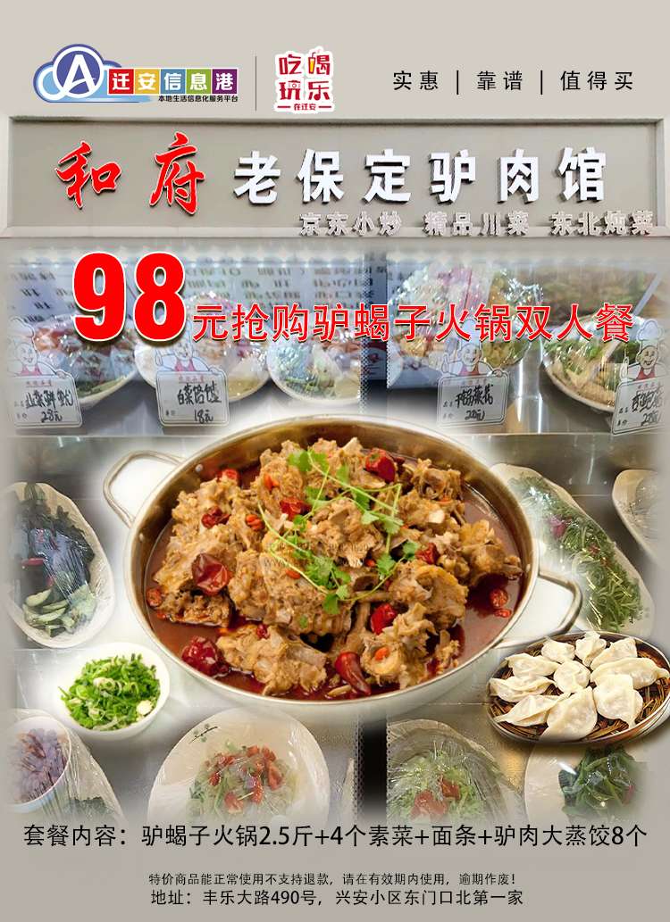 优选首页 > 迁安市保府驴肉馆 迁安市保府驴肉馆 (营业时间:09:00-21:30) 评分:0 15303154567 丰乐大路490,兴安小区东门第一家 证书资质 店铺介绍: 排序方式: 综合排序 销量 价格 商家店铺 扫我购买 【和府老保定驴肉馆】98元抢购驴蝎子火锅双人餐 商家店铺 扫我购买 【和府老保定驴肉馆】168元抢购全驴宴超值四人餐 商家店铺 扫我购买 【和府老保定驴肉馆】48元抢购48只小龙虾 商家店铺 扫我购买 【和府老保定驴肉馆】18.8元抢购驴肉蒸饺(10个)